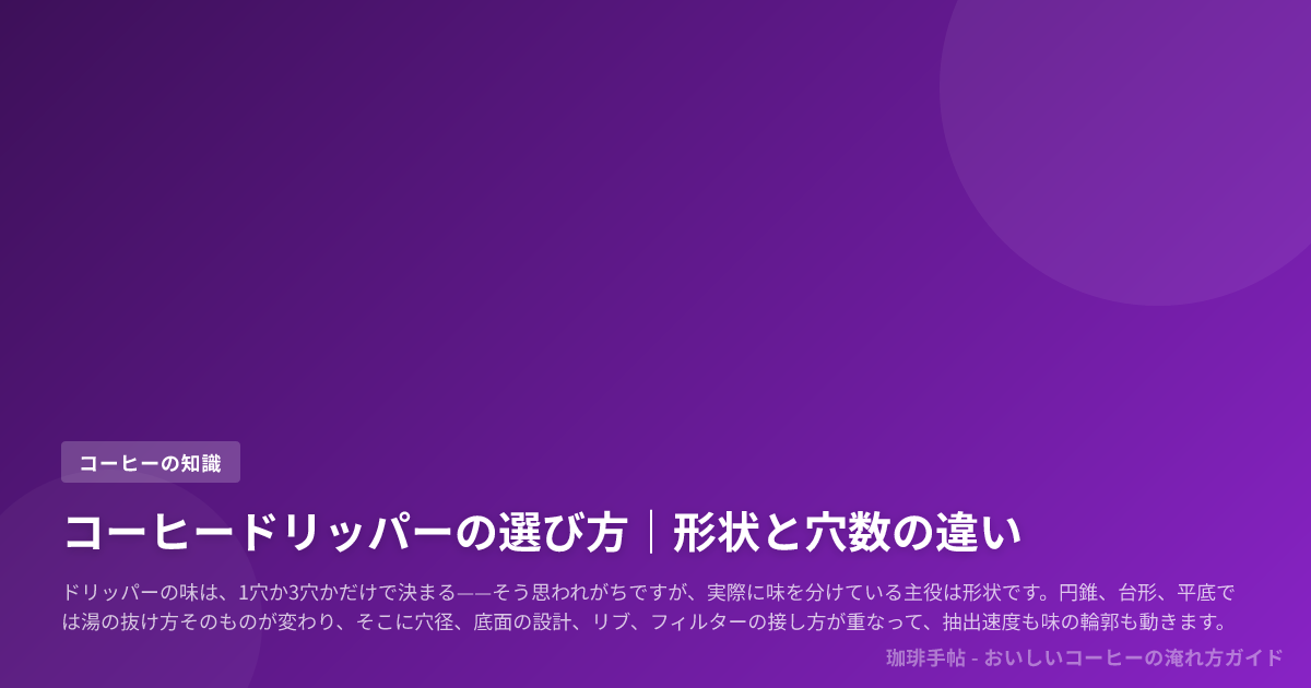 ドリッパーの味は、1穴か3穴かだけで決まる——そう思われがちですが、実際に味を分けている主役は形状です。円錐、台形、平底では湯の抜け方そのものが変わり、そこに穴径、底面の設計、リブ、フィルターの接し方が重なって、抽出速度も味の輪郭も動きます。