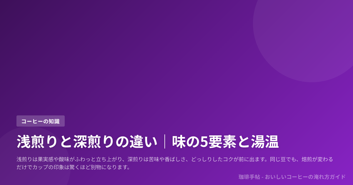 この記事は、「自分には浅煎りと深煎りのどちらが合うのか」をはっきりさせたい人や、家庭のハンドドリップで味をもう一段コントロールしたい人に向けた内容です。味の5要素の比較から、焙煎で起きる成分変化、湯温・挽き目・時間の調整、イルガチェフェの具体例までを一本につなぎ、まず試すべき焙煎度と淹れ方の勘所を整理します。