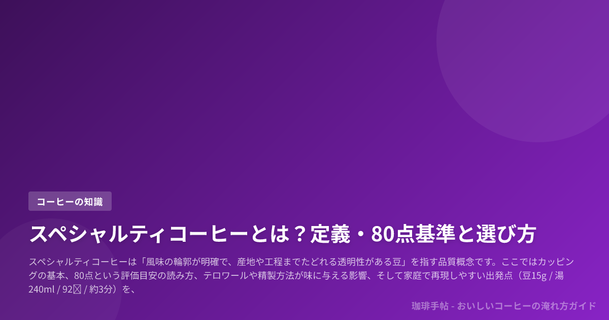 スペシャルティコーヒーは「風味の輪郭が明確で、産地や工程までたどれる透明性がある豆」を指す品質概念です。ここではカッピングの基本、80点という評価目安の読み方、テロワールや精製方法が味に与える影響、そして家庭で再現しやすい出発点(豆15g / 湯240ml / 92℃ / 約3分)を、実践的にわかりやすく整理します。まずは「味を言葉にする」ための視点を押さえましょう。